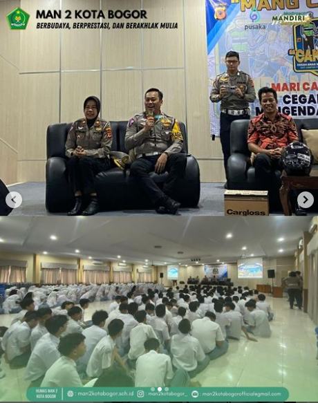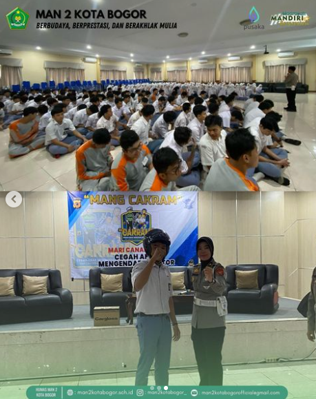 MAN 2 Kota Bogor bekerjasama dengan Polda Jabar dan Satlantas (Satuan Lalu Lintas) Polresta Bogor Kota melakukan penyuluhan mengenai keamanan dan keselamatan dalam berkendara lalu lintas kepada peserta didik kelas XI MAN 2 Kota Bogor. Penyuluhan dihadiri oleh Wakil Kepala MAN 2 Kota Bogor Bidang Kesiswaan yakni, Yayat Supriyatna, M.Pd., Kompol Risdiana, Subdit kamsel Polda Jabar, Kompol Galih Kasat lantas Polresta Bogor Kota dan staff. Kegiatan dilaksanakan di Aula MAN 2 Kota Bogor pada hari Rabu, 21 Februari 2024, mulai pukul 08.45 – 10.30 WIB.