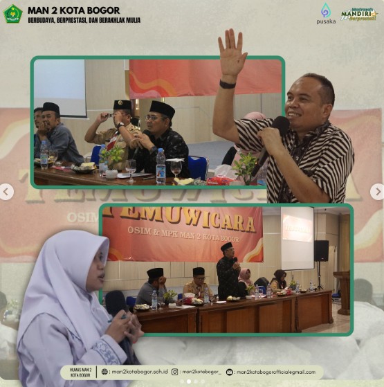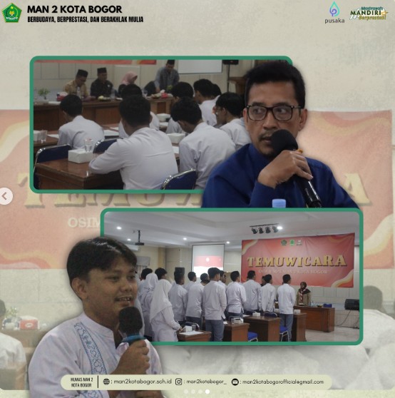 Pada Jumat, 15 November 2024 MAN 2 Kota Bogor melaksanakan “Temu Wicara”. Acara ini berlangsung di aula MAN 2 Kota Bogor dan dihadiri oleh para perwakilan siswa dari masing-masing kelas, jajaran wakil kepala, komite serta para panitia dari OSIM dan MPK MAN 2 Kota Bogor.